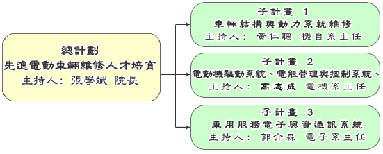 為使維修人才培育計畫順利執行,在考量本校機電學院各系之教師學生專長特質,本計畫共分為三個子計畫,由相關系所負責推行,如計畫組織如下所示。